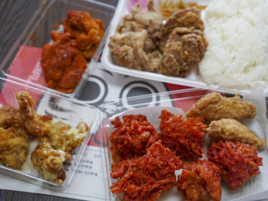 1番人気の「醤油・旨塩あいもり弁当」をご飯特盛りでお願いしました。他にも個性派の唐揚げがあり、気になったのを単品でいくつか追加して。