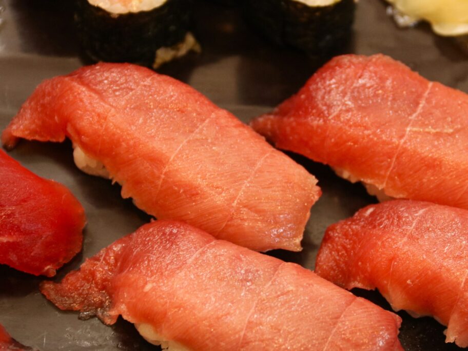 「バチ(メバチマグロ)の最高品。うちの自慢です。さっぱりとした口当たりで、脂もしつこくないんです」。皿は赤一色。艶がありますね。