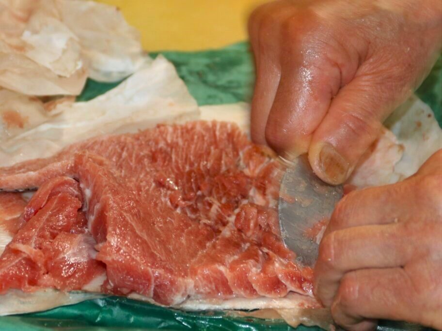 注文すると、ご主人、石井一義さんが脂の乗った腹上(ハラカミ)を皮からスプーンで剥がしています。これぞ、本物のネギトロ。細巻にします。