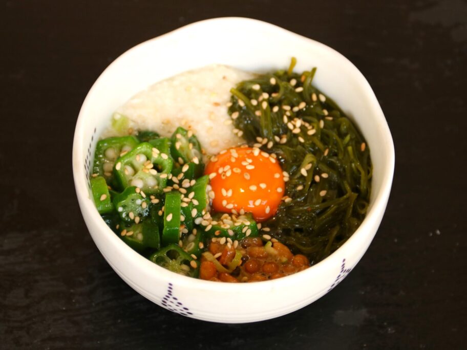 想像した通りでした。ネバネバ4兄弟、納豆、オクラ、とろろ、メカブがたっぷり。真ん中に卵黄が鎮座し、白ゴマが降りかかっています。色合いもよく、見ただけで食欲が沸いてきますね。