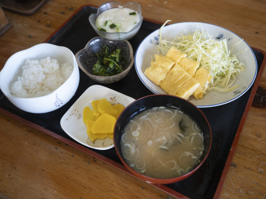副菜も充実しています。たっぷりのサラダに冷や奴と香の物。味噌汁はきちんと出汁を取っています。ご主人、相変わらず仕事していますね。