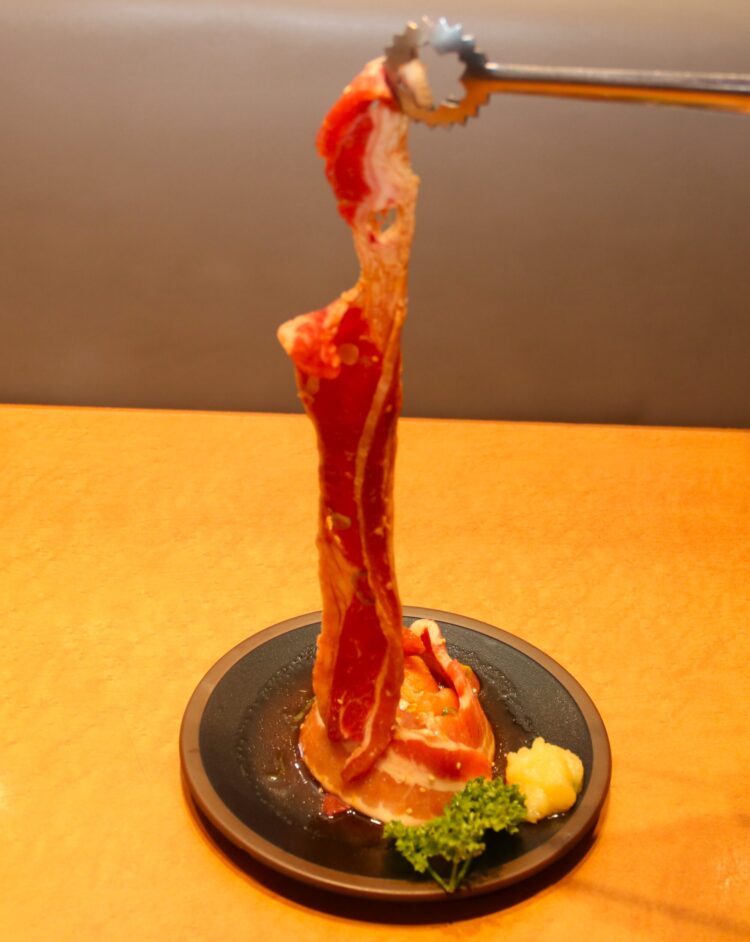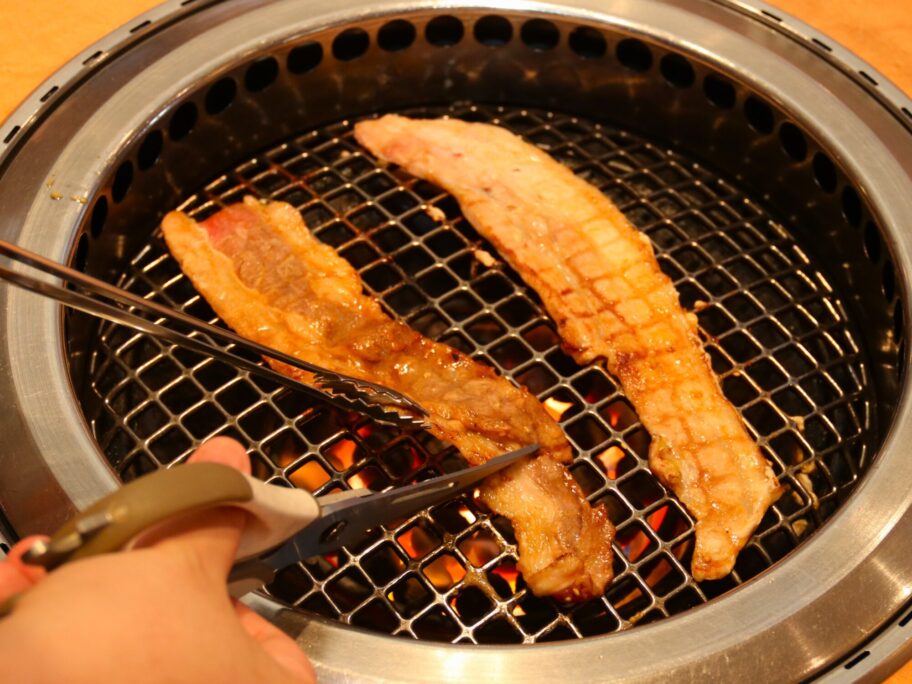 まずは、カルビを牛と豚の連弾で。真っすぐ置くと焼き網からはみ出してしまうので少し曲げて。脂が落ち、煙で燻されます。いい感じに焦げ目が付いたらひっくり返し、ハサミで一口大に。
