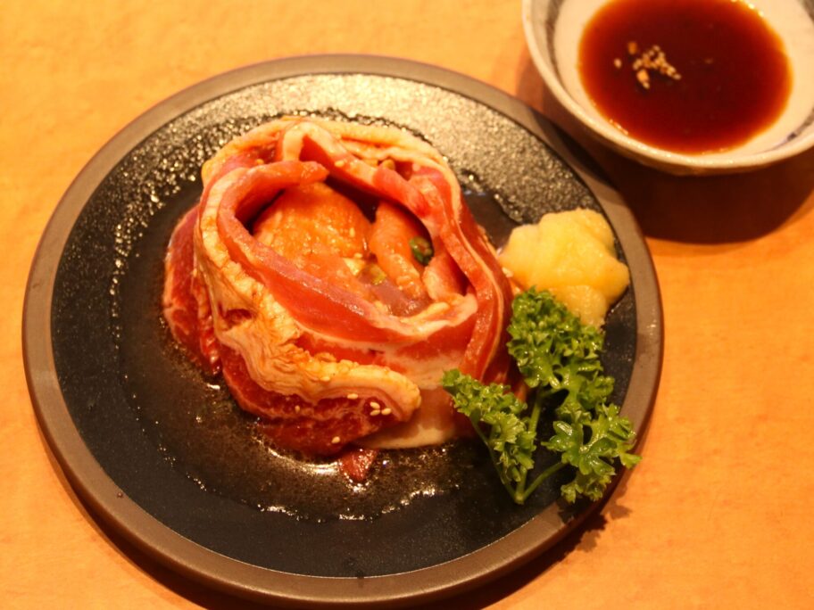 20㌢はあるでしょうか、長い牛カルビと豚カルビに包まれるように内臓系が詰まっています。傍らにはすりおろした生ニンニクがたっぷり。これが起爆剤になるとは、まだこの時は気が付きませんでした。