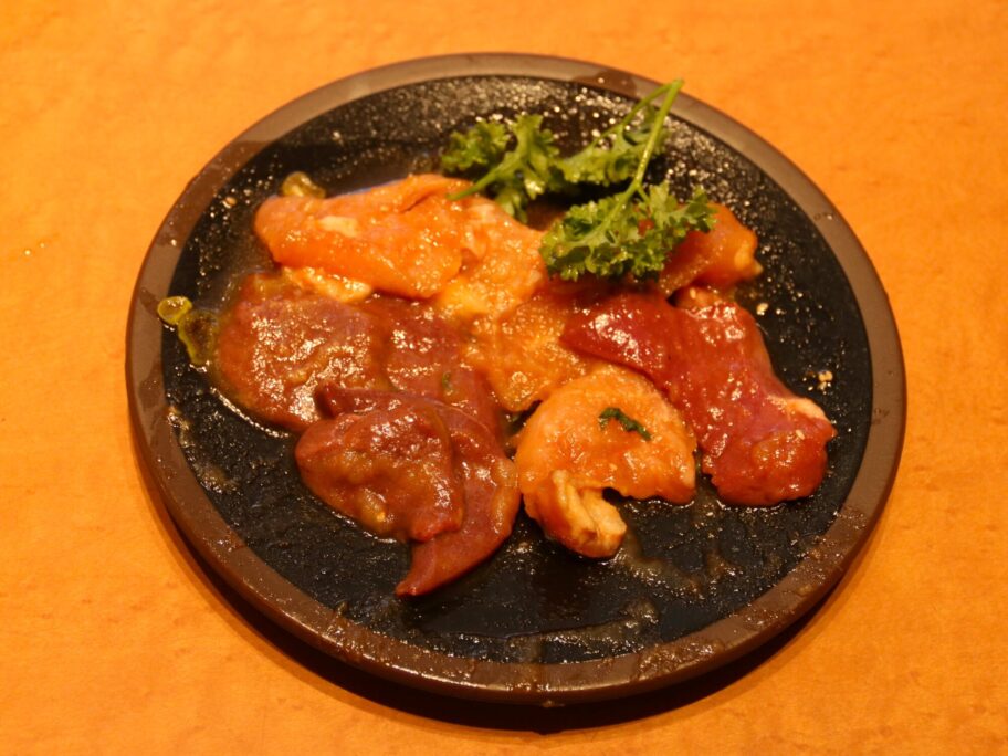 大物に続いて内臓系を。豚のレバー4切れ、ハツ1切れ、それと鶏のムネ肉が4切れあります。もみダレで味が付いていますが、これに大量のニンニクを混ぜこんで焼いていきます。