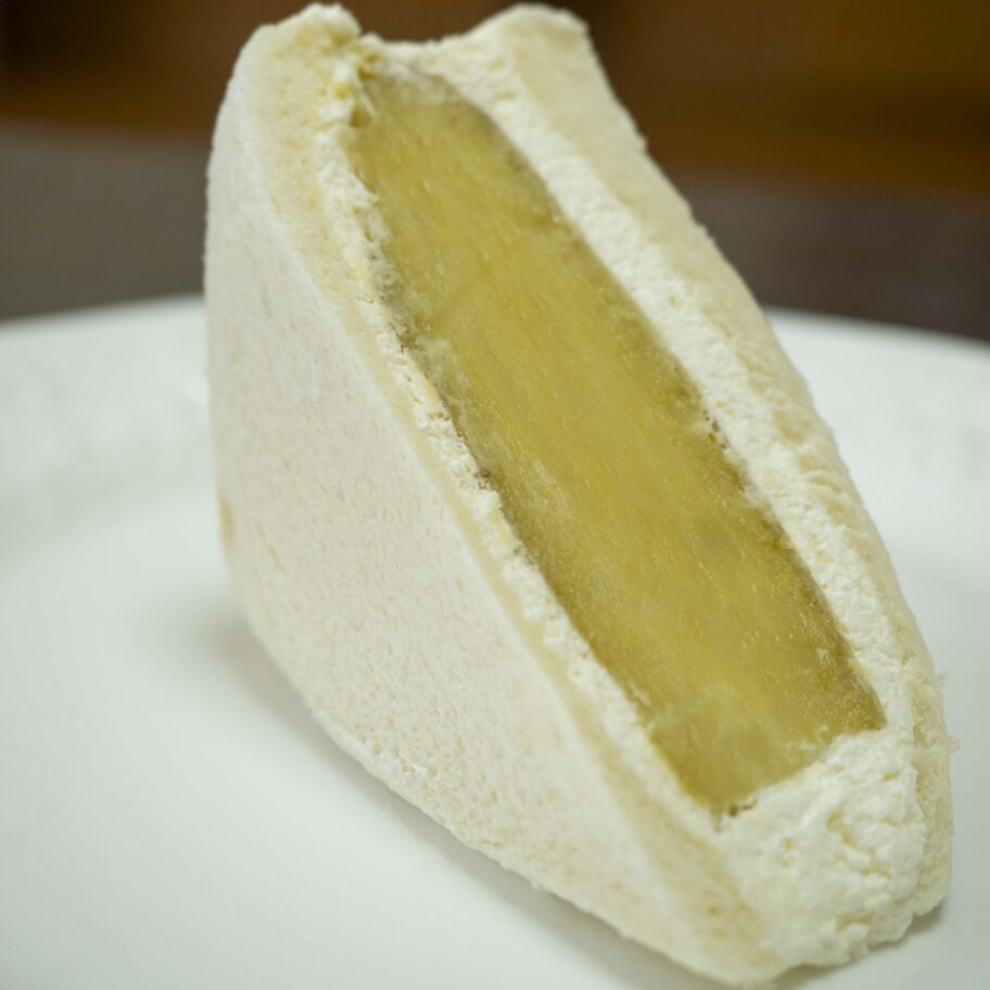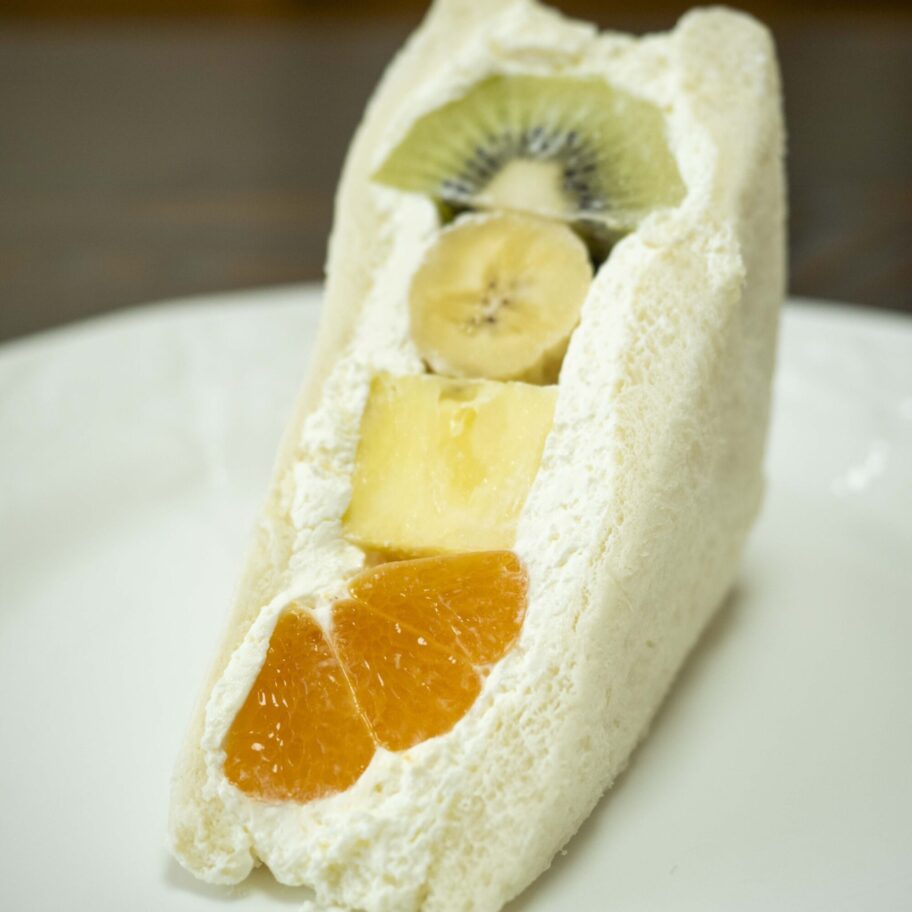 まずは一番人気の「ミックスサンド」をいただきました。断面に彩りよく並んだのはキウイ、バナナ、パイナップル、ミカン。特にキウイは1/4個ほどをそのまま挟んでおり、かぶりついた瞬間に果汁が口いっぱいに広がります。