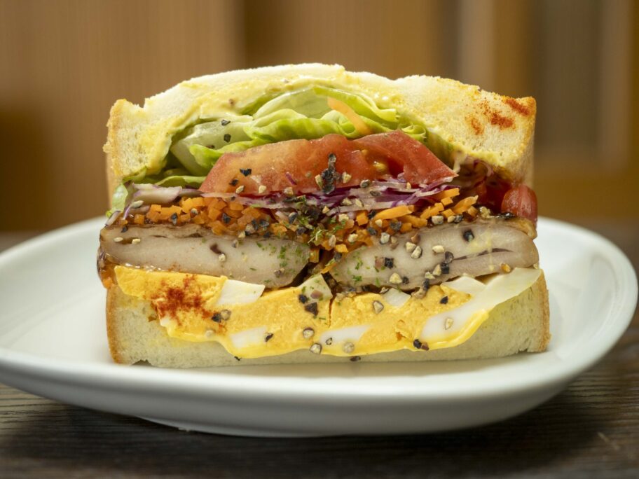 甘い系だけでなく、食事系のサンドも試してみました。厚さ6㌢ほどもある「照り焼きチキンサンド」は、ボリューム満点です。紫キャベツ、レタス、トマト、ニンジン、ゆで卵、チーズが層になり、色合いも鮮やか。