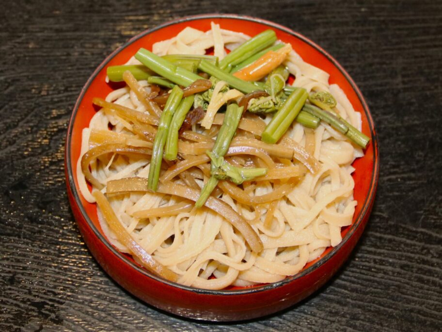 2枚目は山菜。たっぷりあり、キンピラゴボウも入っています。山菜の香りにゴボウの甘みが加わり、美味しさ倍増。七味が合います。
