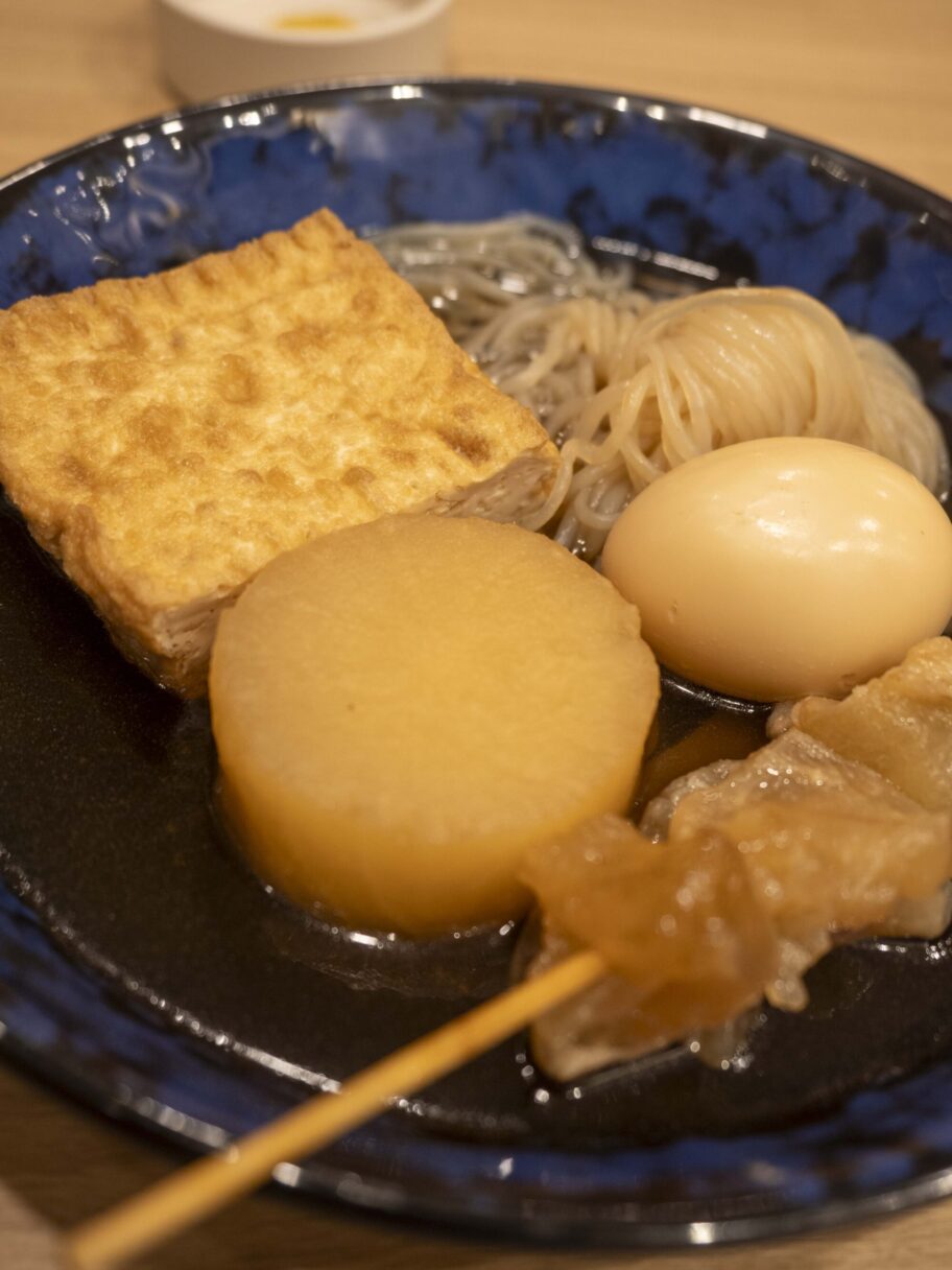 うどんを待つ間にいただいたのは「おでん5本セット」です。牛スジ、ダイコン、タマゴ、厚揚げ、しらたきという定番の組み合わせで、透き通った出汁が素材の味をやさしく引き立てます。牛スジはとろけるような柔らかさ、大根は芯までしっかりと染み込み、口にするたびにほっとする味わいです。