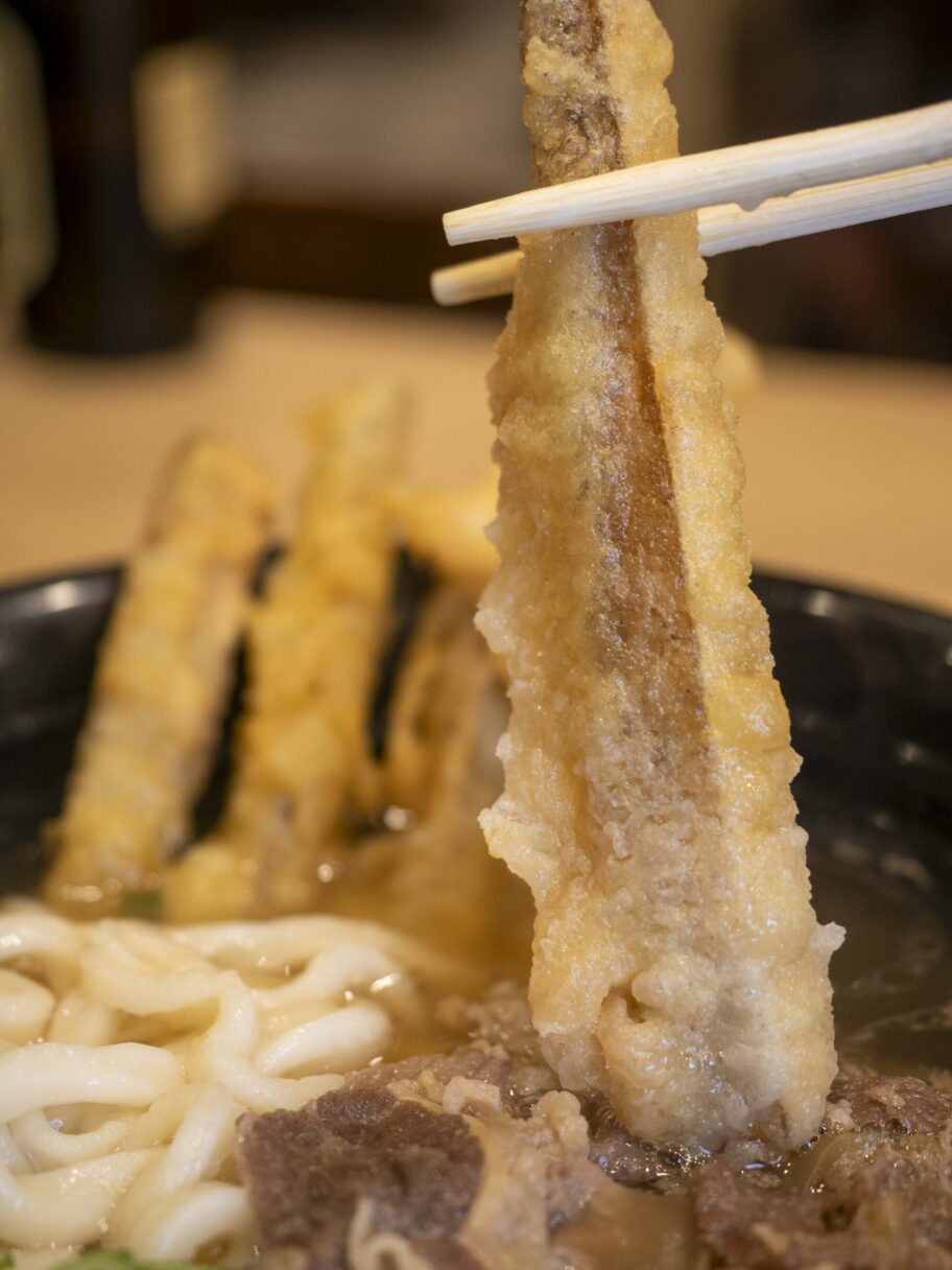 ごぼ天は5本も丼に乗っています。太いゴボウをそのまま揚げた豪快な天ぷらは驚くほど柔らかく、甘辛く煮た牛肉とともに、ひと口ごとに一体感のあるおいしさが広がります。