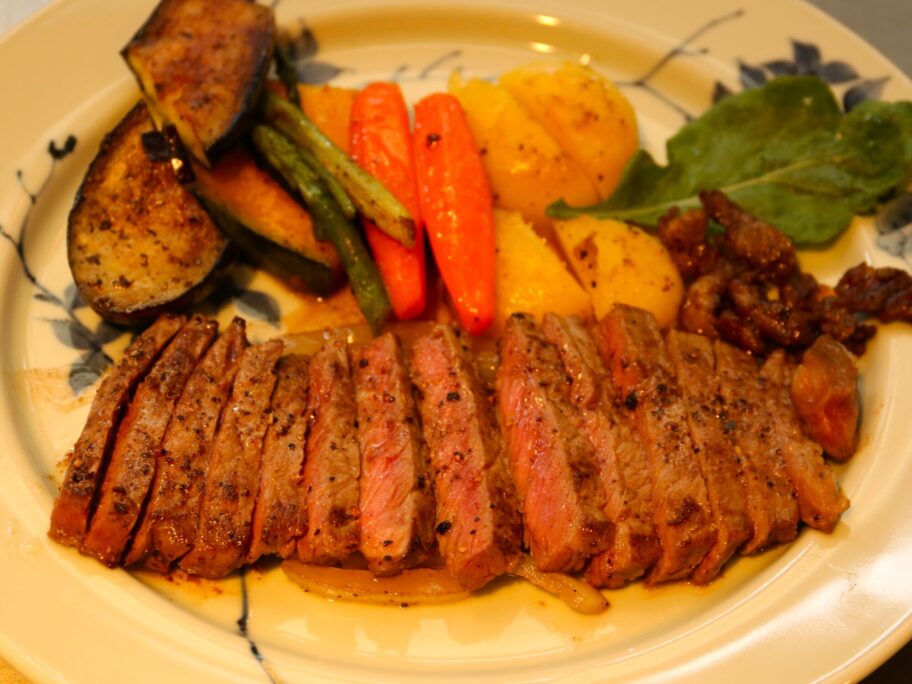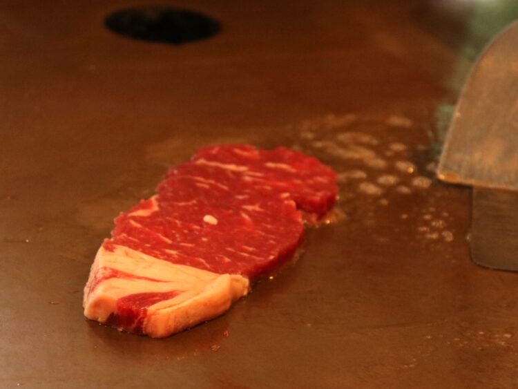 「お肉の焼き加減はどうされます」「ミディアムレアで」。すると、「脂身はカリカリにしましょうか」と薦めてきます。注文したのはサーロイン。赤身に細やかなサシが入っていますが、脂身の部分もあり、肉とは別にクリスビーに仕上げてくれました。