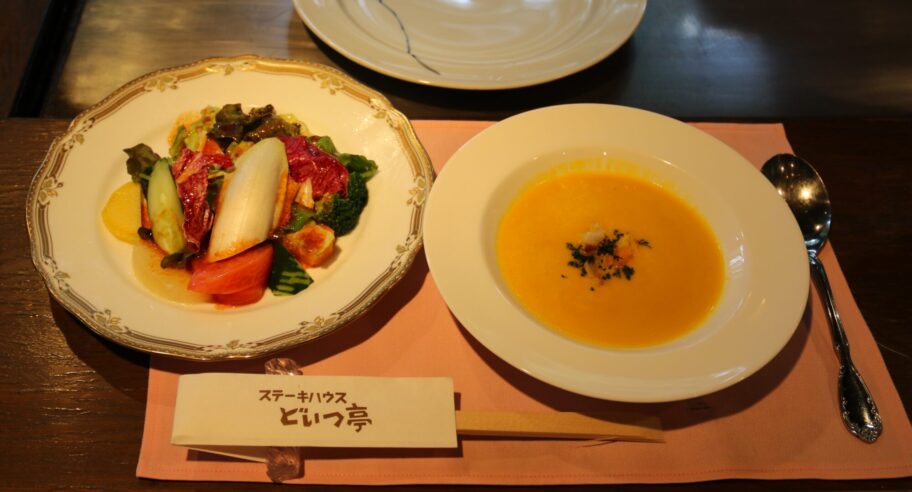 ▲自家製野菜をふんだんに使ったサラダとスープ