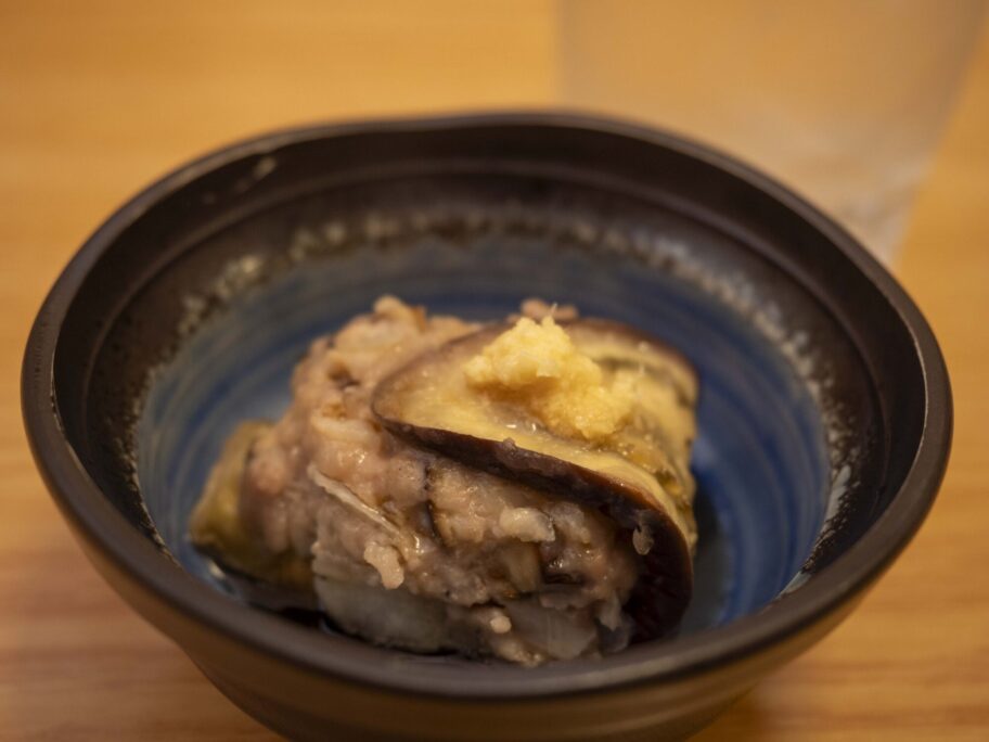 この日のお通しはつくねをナスで挟んだ煮物でした。つくねの中にタマネギが入り、薄味で炊かれています。お通しで店のレベルが分かりますね。