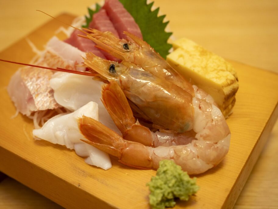 3点盛りとあった刺身はマグロ、北海生タコ、ボタンエビ、ハナダイに玉子焼きの5点盛り。こういう誤算は大歓迎です。「小トロ」と言っていいマグロ、肉厚の生タコが特によかったですね。