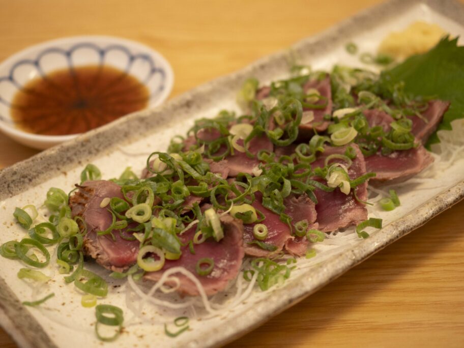 牛タタキは青ネギがたっぷり。ニンニクもありますがショウガ醤油の方が全体の流れに合います。