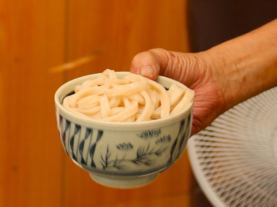 「お替りお持ちしますね」。接客を担当する小野利一さんがお椀に入ったうどんを空になった皿に投入します。何と最初と同じ大盛り。1人前400㌘あり計800㌘。天丼と合わせると1㌔超えです。