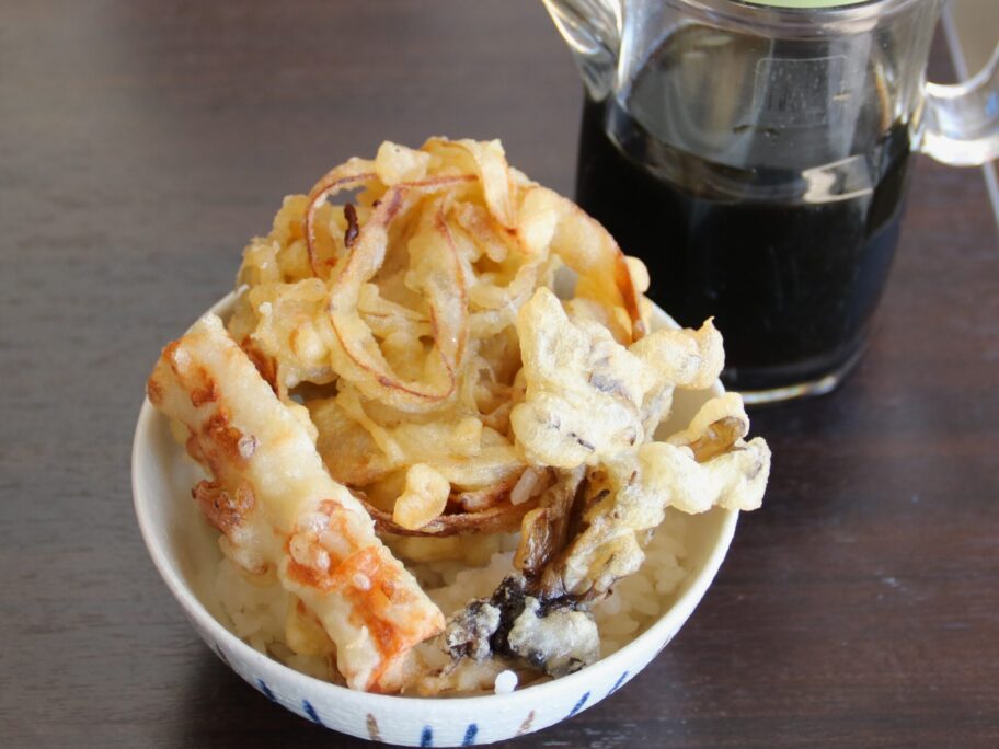 ご飯も食べ放題。茶碗に盛りゴボウ、マイタケ、チクワを載せ、天丼用のタレをかけてみました。ミニ野菜天丼の出来上がり。これも旨いな。