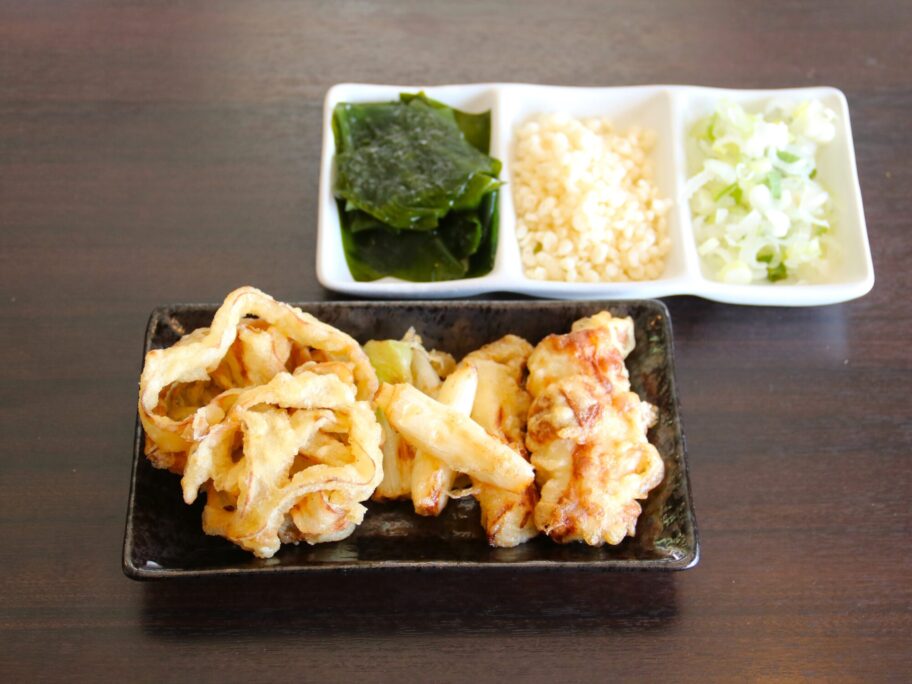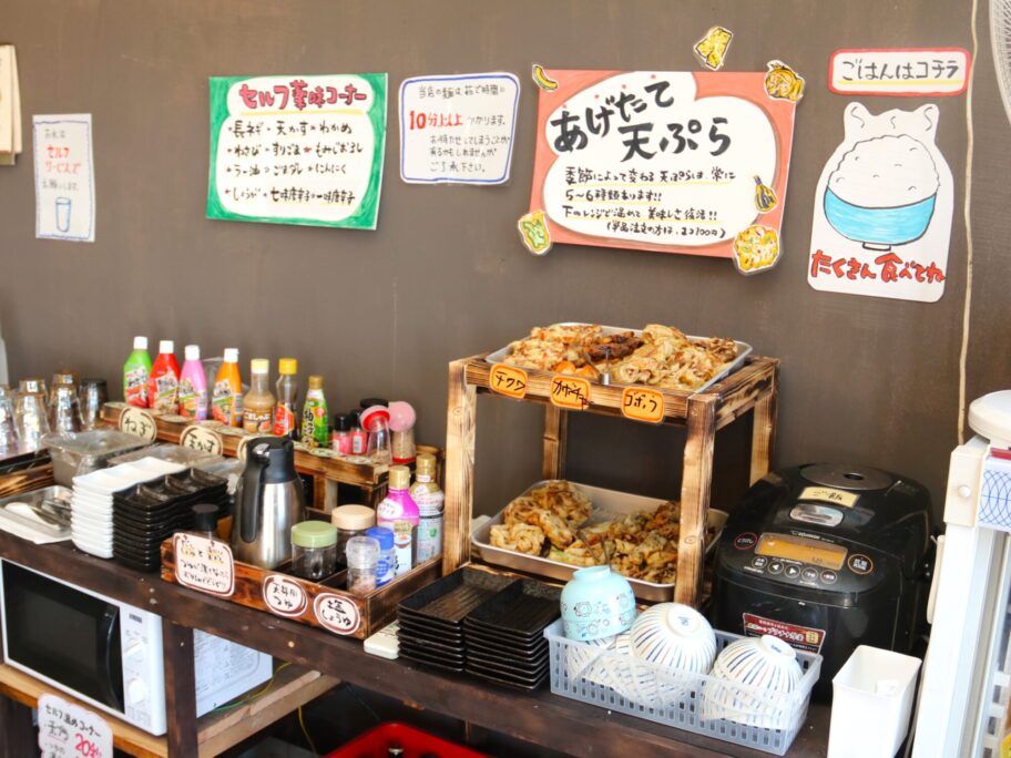 うどんは食べ放題。好きなだけお替りできます。8種類ほどの天ぷら、豊富な薬味も取り放題です。