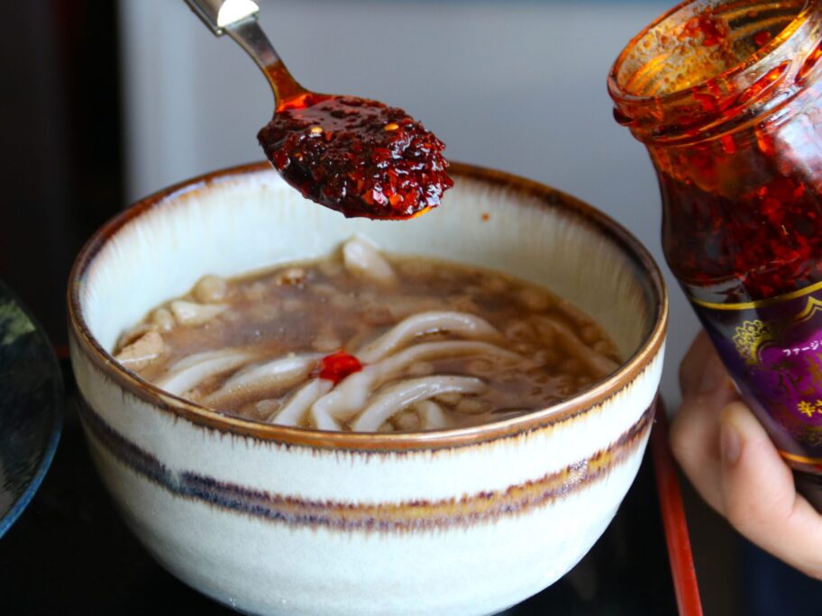 2代目はうどんをさらに半分お替り。ニンニクと花椒入りのラー油を入れ激辛にして味わっていました。