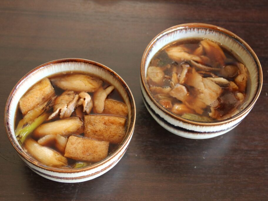 ▲肉汁(手前)とキノコ汁。ともに豚バラがいっぱい