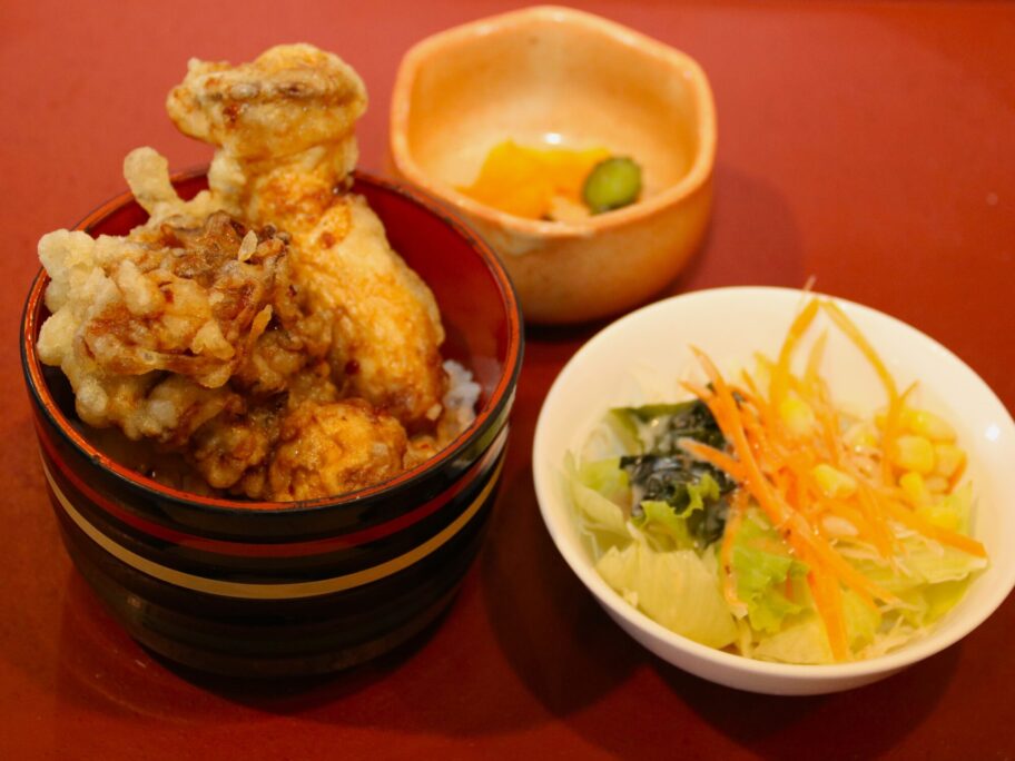 ミニ天丼の天ぷらは大きなマイタケ、中くらいのエリンギ、小さなマッシュルームの3兄弟。マッシュルームの天ぷらは初めてでした。肉厚でほのかに独特の香りがします。カエシをベースにしたタレが染みて、ご飯が旨いったら。