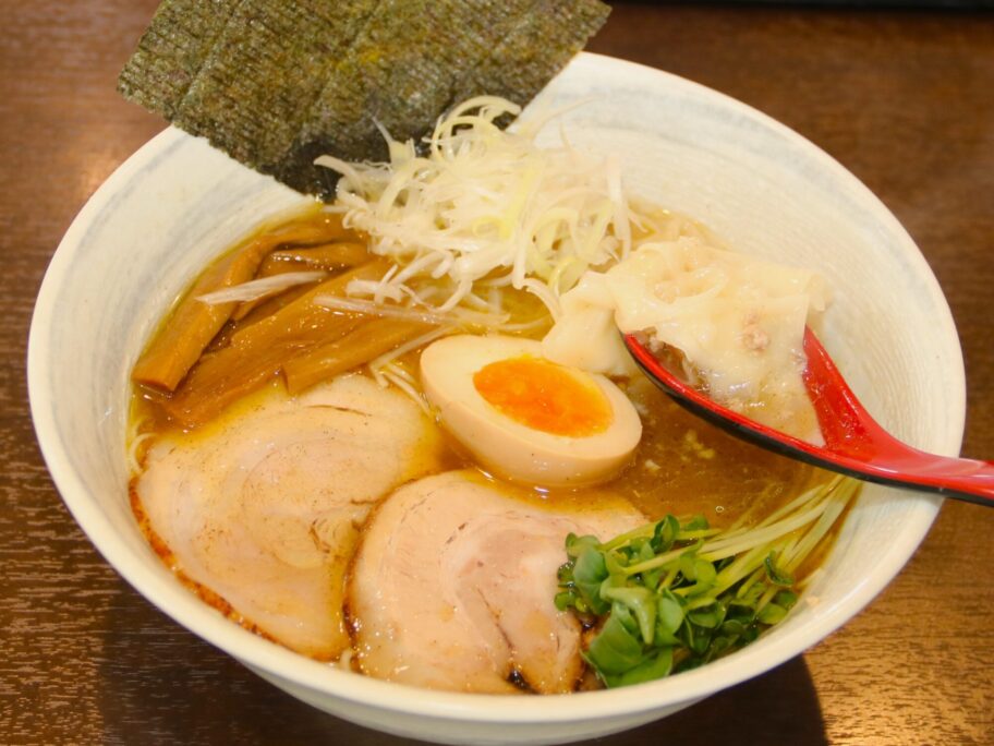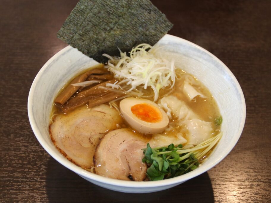 看板のととやめんか江戸つけめん、はたまた日本蕎麦のうますぎそば。いつもこのどれか。すべて30年以上継ぎ足した蕎麦のカエシを使った醤油味です。新メニューに挑戦しようと、「しおめん」をお願いすると、「塩ならホットがお薦めですよ」と店主の谷藤勉さん。気になっていたあれも付けちゃいましょう。注文は「しおわんたんめんホット」です。