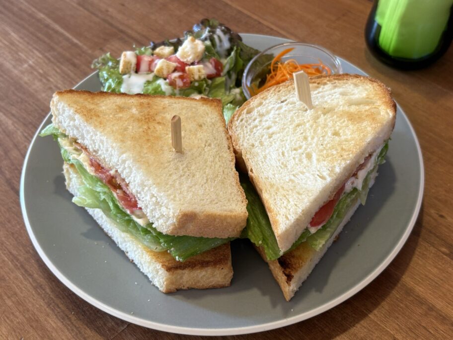 トーストした山型の食パンにベーコン、レタス、トマトを挟み、二等分に。手に取るとずっしり重く、パンの角が指に当たります。