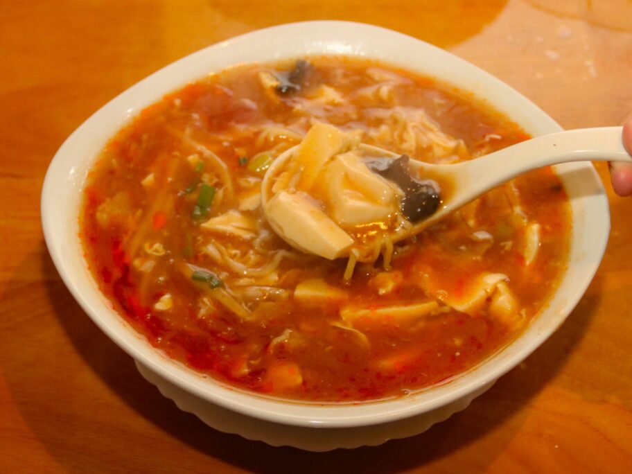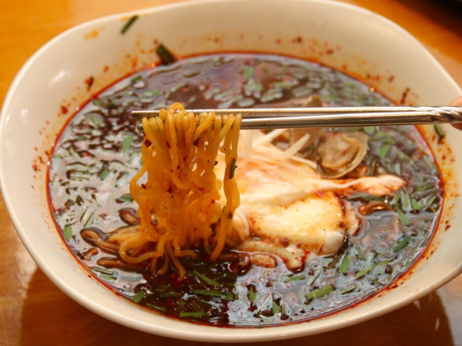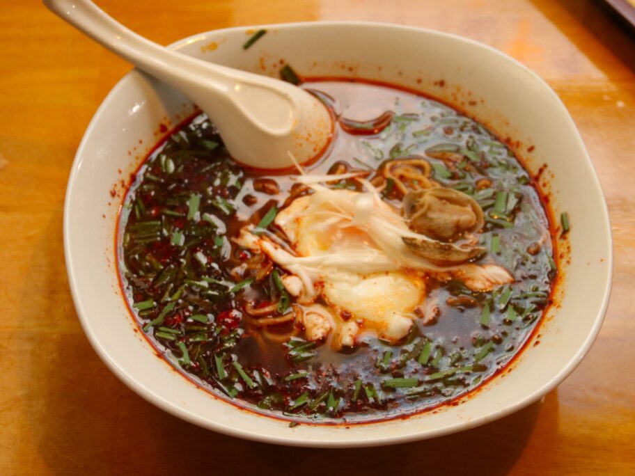 覚悟を決めて、スープを一口。おやっ、それほど辛くな…くはない。唐辛子の鮮烈な辛さにすぐさまこめかみから汗が出てきます。