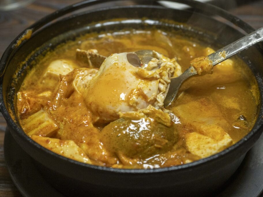 スンドゥブはレトルトの素を鍋に入れ、豆腐とアサリ、卵を加えて煮込みます。卵が固まりかけたらニラを落として出来上がり。辛い中にアサリの旨みが広がり、これもご飯によく合います。