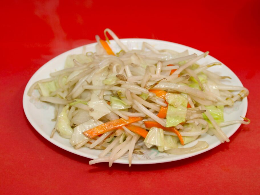 野菜炒めはキャベツ、モヤシ、ニンジンとタマネギ。肉はありません。文字通りの野菜炒め。潔い。しかも、炒め具合が絶妙です。高温で一気に炒めるので野菜がシャキシャキ。野菜が旨い。