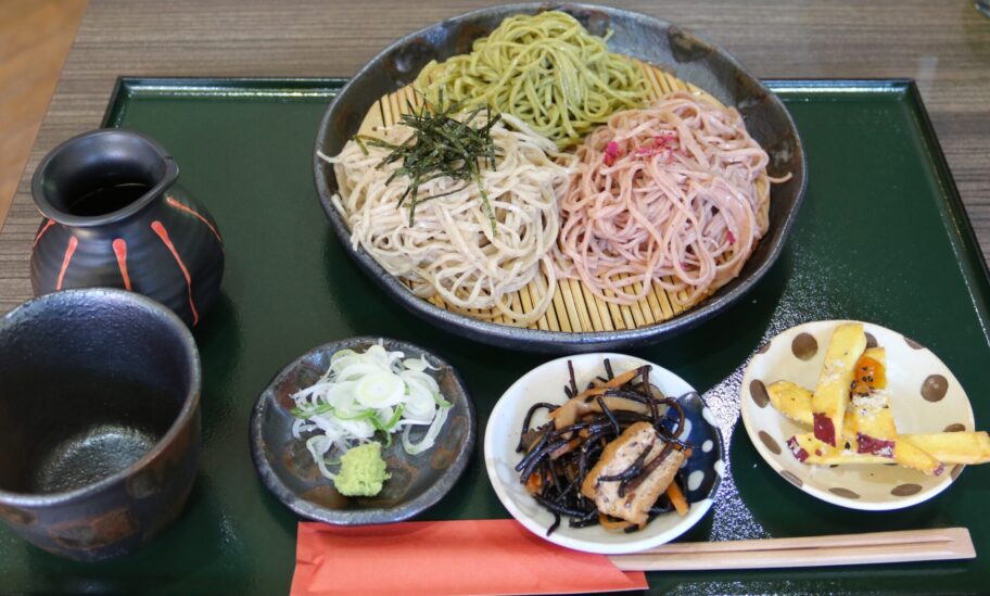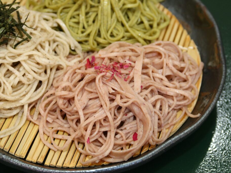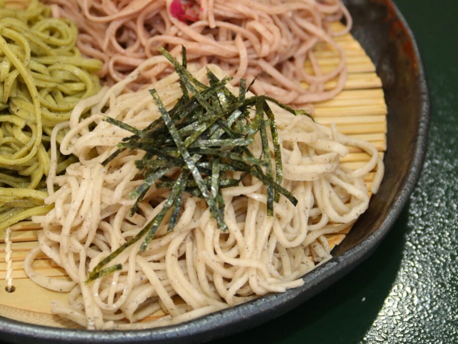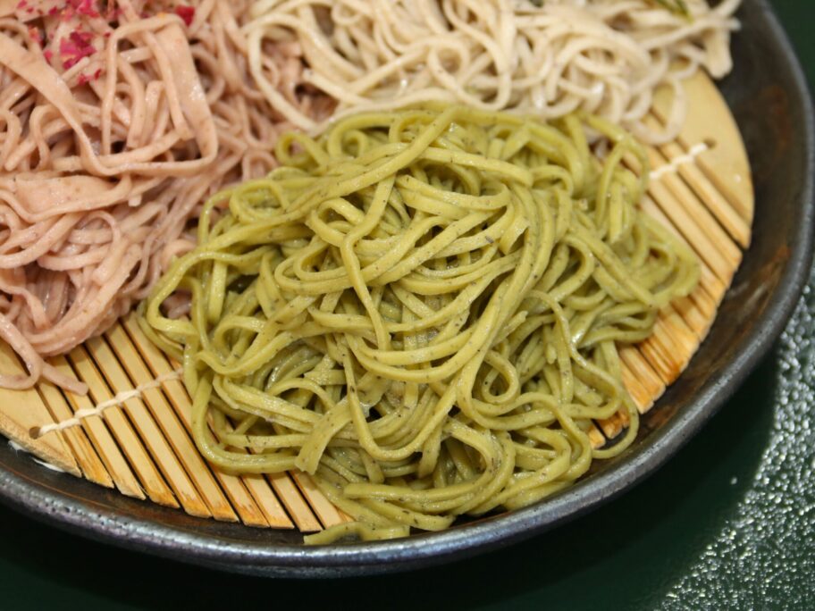 鮮やかなピンク、森のような緑、野趣あふれる黒。3色の蕎麦がざるに盛られてきました。平日に数量限定で提供する「三色もり」をいただきます。