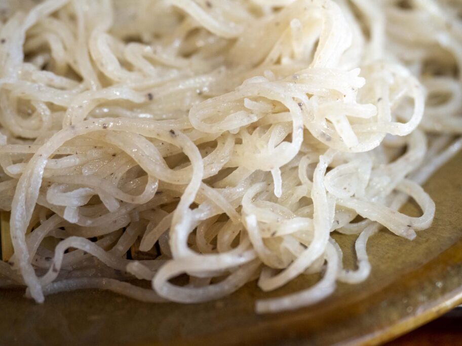 黒みがかった蕎麦は確かに田舎蕎麦です。「星」もあります。二番粉、三番粉に甘皮も入れるのでしょう。ただ、こんなに細く、気品のあるのは初めて。田舎といえば、太くて硬い。自分の中にあったそんな概念をぶっ壊してくれました。
