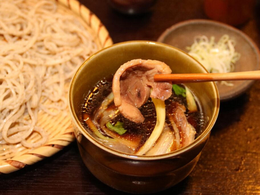 力強さも兼ね備えた蕎麦に合わせて鴨汁に。店の一押しです。鴨肉がたっぷり入った汁は強い旨みと脂が加わり、野趣あふれる味わい。鴨肉は噛むほどに旨みが広がります。これを引き立てるのがネギの香り。「鴨ネギ」とはよくいったものです。