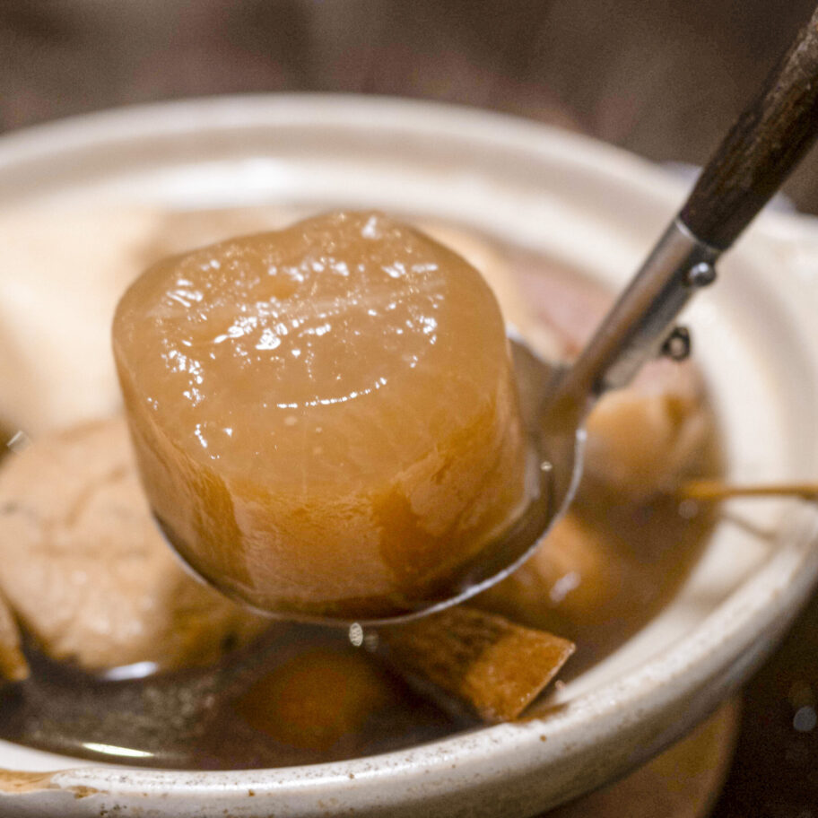 まずはダイコン。箸を入れるとすっと通り、口の中で出汁があふれます。玉子には辛子をたっぷり。ハンペンは早めに。ツブ貝やロールキャベツなど、珍しい具材も多く、どれも茶褐色に染まって味がしみています。おでんの汁をすすりながら熱燗を一口。体の芯から温まります。
