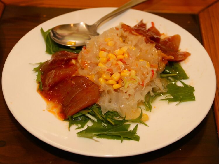 続いては、「白木耳(キクラゲ)の冷菜とハマチの四川風カルパッチョ」。創作中華の本領発揮ですね。豆板醤の効いたピリ辛のタレに漬けこんだハマチは絶品。白キクラゲのコリコリした歯応えもいいですね。