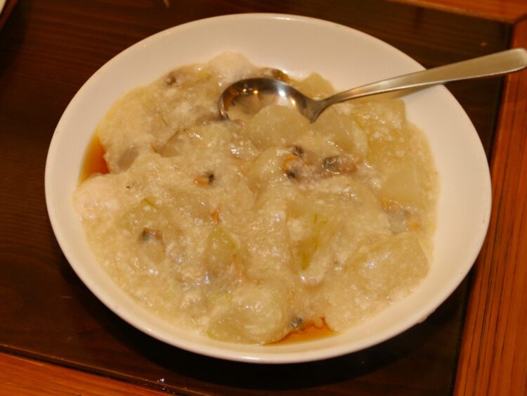3品目は「冬瓜とアサリのふわふわ煮込み」。淡い翡翠色のスープから磯の香りが立ち登ります。