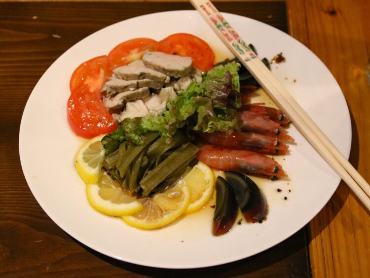 ビールで乾杯。前菜の盛り合わせが出てきました。鶏の酒蒸し、甘エビ老酒漬に山クラゲ。香りのいい甘エビ老酒漬がことのほか評判よく、紹興酒に切り替えます。延々と。