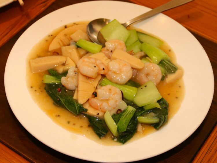 肉料理は「豚肉の山椒蒸し」。柔らかく蒸した豚バラ肉に甘辛のタレが掛かっています。脂身の甘みを山椒がピリッと引き締めてくれます。