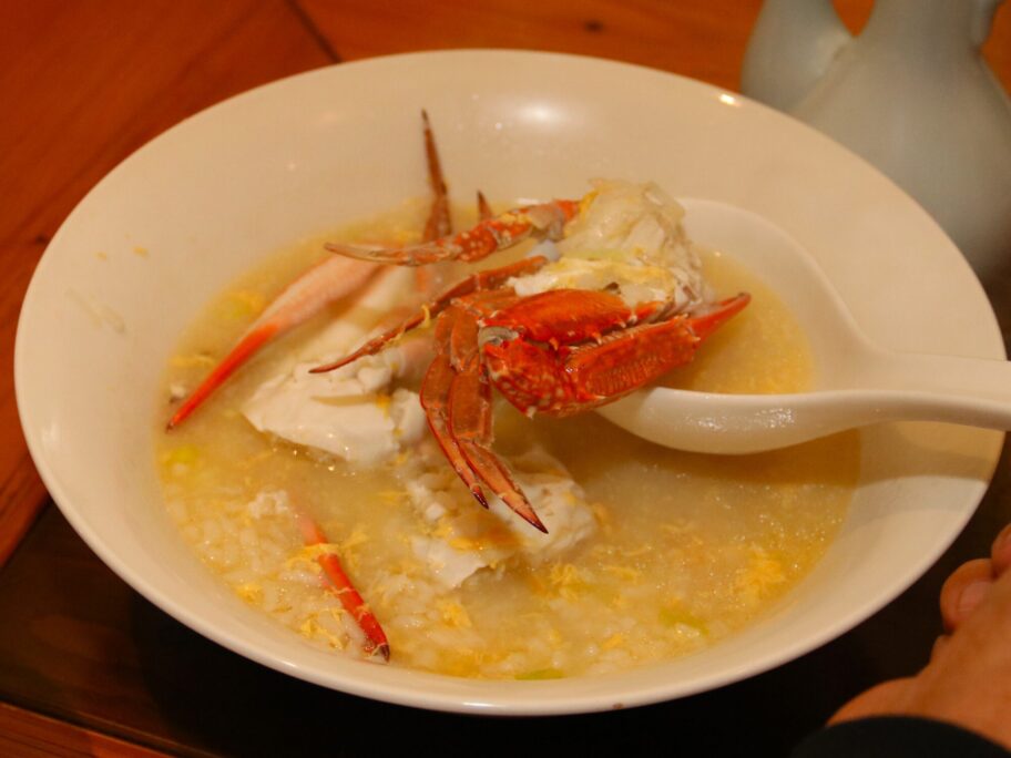 「渡り蟹の雑炊」です。大きなカニがどんと乗っています。カニの旨みが染みこんだ雑炊はもう最高。もちろん、カニの脚もむしゃぶりつきました。