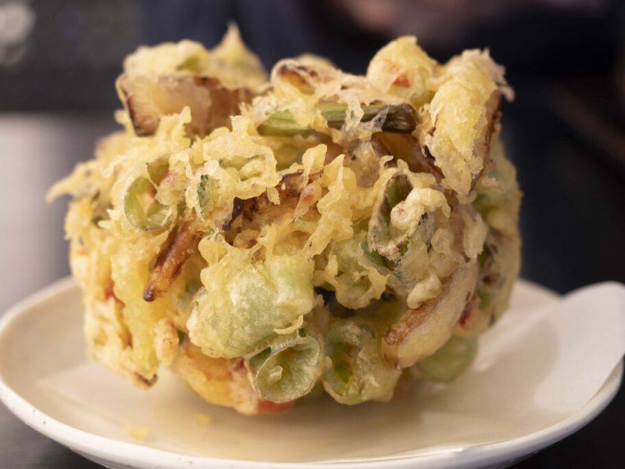 かき揚げはうれしいことに揚げたて。しかも、でかい。直径10㌢、高さ7㌢の円柱。長ネギ、タマネギ、ニンジン、干しエビと具材も豊富です。