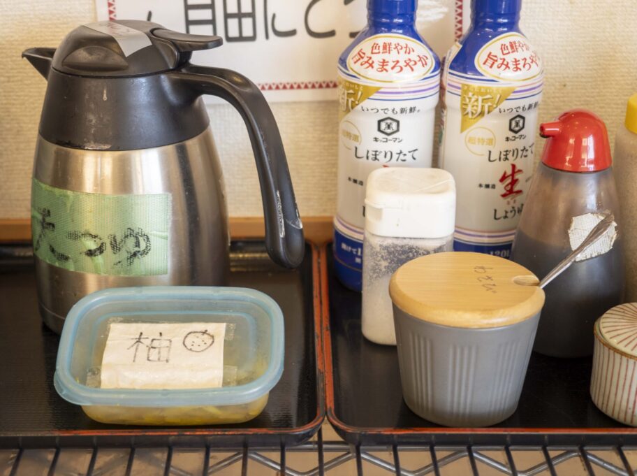 ▲ユズや胡麻、天つゆの置かれた薬味コーナー