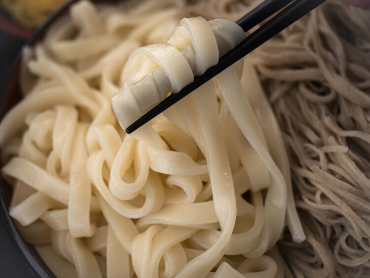 幅1・5㌢ほどのうどんもコシがしっかりしています。それでいてもちもち。これまた大当たりです。