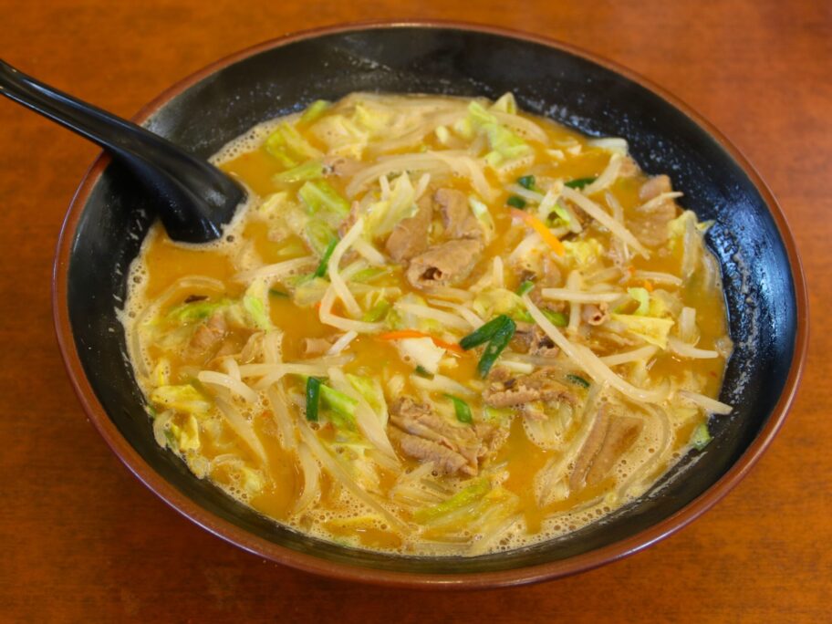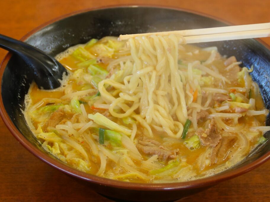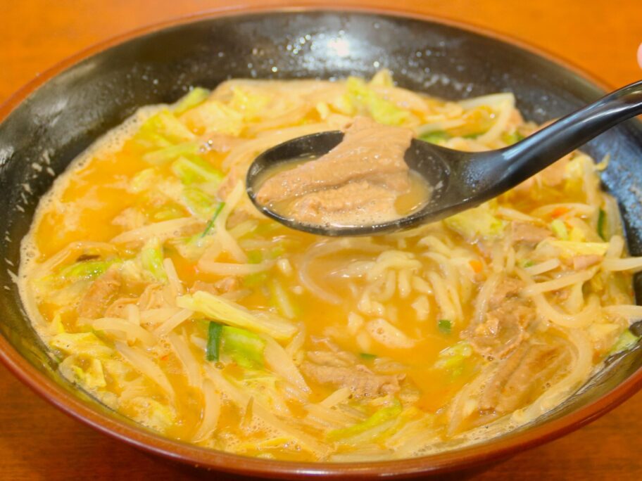 まずは具で蓋をされて熱々のスープを一口。ちょい辛の味噌味です。豚骨がベースのようで、背脂も少し浮いています。もつと野菜からもコクと旨みが加わり、クセになりそうな独特の味になっています。