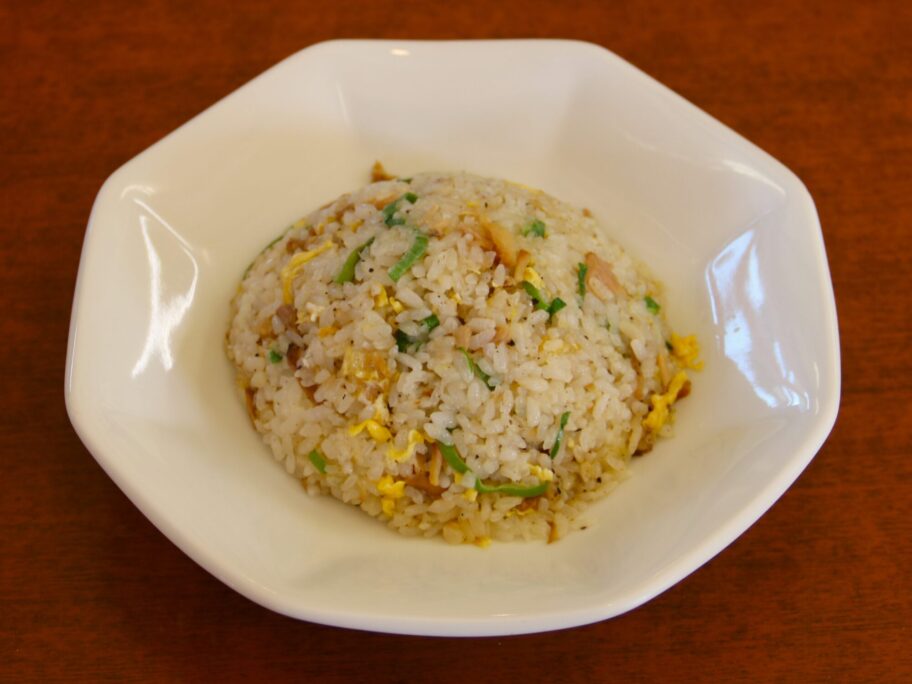 チャーハンはパラパラ系です。具は玉子とチャーシュー、ネギ。ラーメンと一緒に食べるため、あっさり薄味の塩加減に仕上げています。