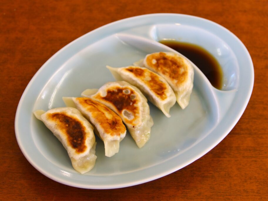 餃子は野菜が多めでジューシー。ニンニクがよく効いています。こちらも食べるラー油を使い、激辛にしてチャーハンとともにいただきます。