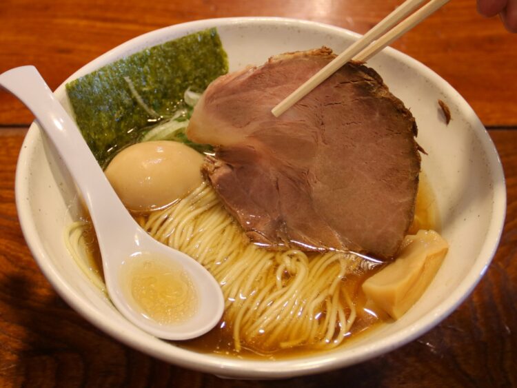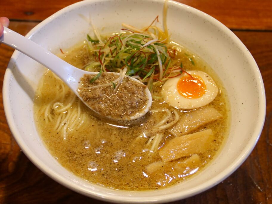 では、肉味噌を少しずつ溶かして。挽き肉は担々麵によくある粗挽きではなく、きめ細やか。極上のスープとの調和を大切にしています。ゴマの香ばしさ、味噌の甘み。ニンニクやショウガも入っているでしょうか。奥行きのある味になってきます。