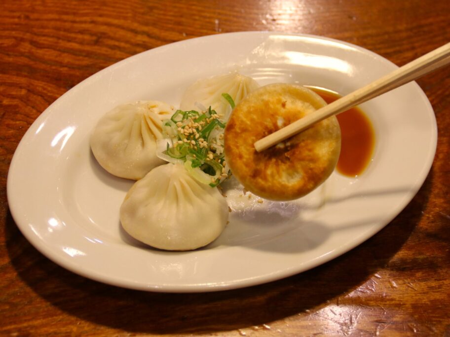 ゴマとネギが掛かっています。正しい。酢醤油に付けて噛むと、口の中に肉汁がジュワーと広がります。熱っ。学習能力がなく、毎度の口内火傷です。