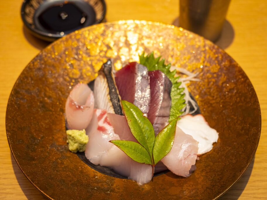 続く刺身の盛り合わせは迫力十分。これで一人前です。梅村さんは「ほとんどは長崎五島列島から今朝、届いた魚なんですよ」と話します。キントキダイ、天然カンパチ、メジナ、カツオ、そして珍しいホッケの刺身まで8種類。鮮度の良さがそのまま旨みに変わり、生ワサビの香りが後味を整えました。