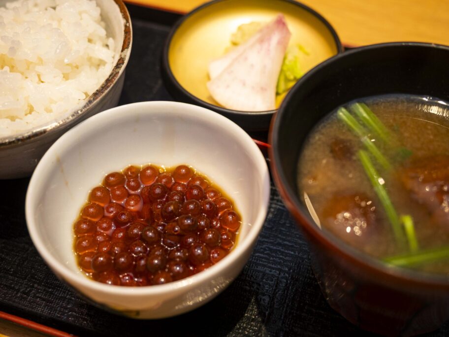 締めは「今日はとびきりのイクラが手に入ったのでイクラご飯です」と梅村さん。炊きたてのご飯に醤油漬けの大粒イクラをのせた一杯は、噛むたびに旨みが弾けます。味噌汁には梅村さんが山で採るという天然ナメコが入り、最後まで満足感が続きました。