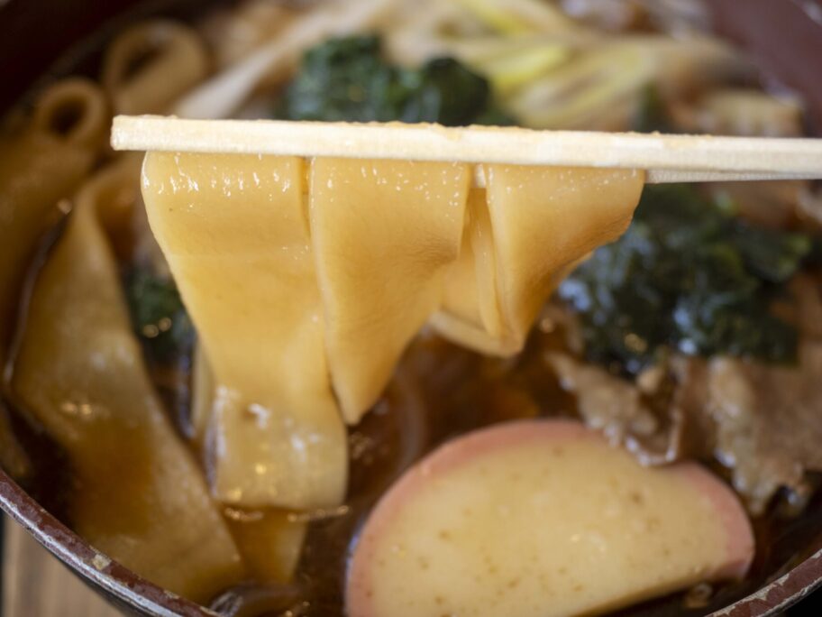 まずは、ひもかわをいただきましょう。幅2㌢、やや厚のしで鍋焼きにしても負けないコシがあります。よく汁を吸ったひもかわ、いい味しています。汁はすき焼きよりぐっと甘さ控えめ。牛肉のコクが加わり、旨みが膨らむ感じです。