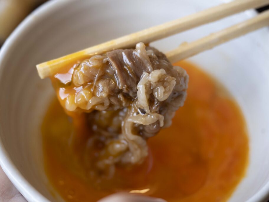 小皿と別に生卵の入った小皿が用意されています。そのまま食べてもいいし、すき焼きのように卵に絡めてもいいわけです。